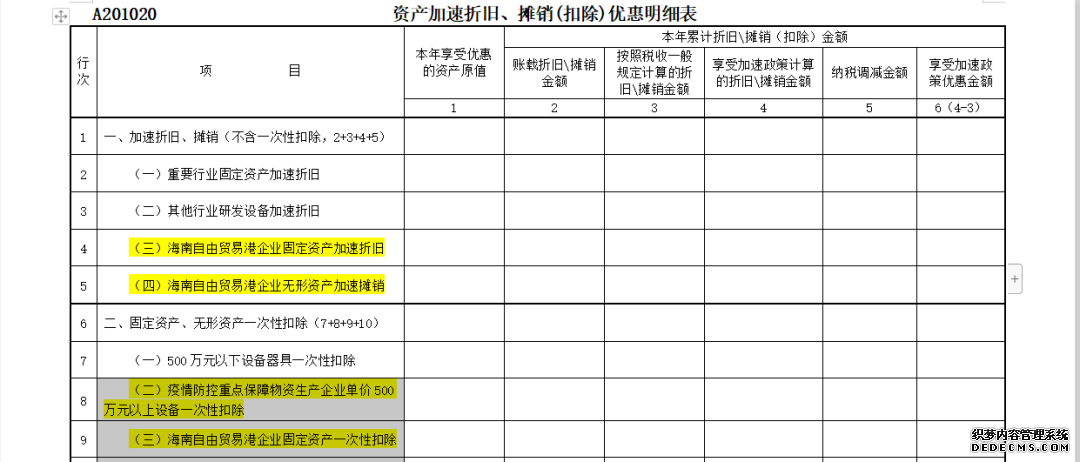 3.为落实海南自由贸易港资本性支出扣除政策和疫情防控重点保障物资生产企业设备一次性扣除政策,一是将原《固定资产加速折旧(扣除)优惠明细表》(A201020)名称修改为《资产加速折旧、摊销(扣除)优惠明细表》(A201020);二是增加“海南自由贸易港企业固定资产加速折旧”“海南自由贸易港企业无形资产加速摊销”“海南自由贸易港企业固定资产一次性扣除”“海南自由贸易港企业无形资产一次性扣除”“疫情防控重点保障物资生产企业单价500万元以上设备一次性扣除”等行次,并明确相关行次的填报要求。
