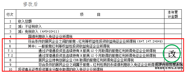 原第6行调整为第7.1行,项目名称修改为“通过沪港通投资且连续持有H股满12个月取得的股息红利所得免征企业所得税”,业务规则不变;