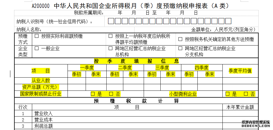 一、《中华人民共和国企业所得税月(季)度预缴纳税申报表(A类)》(A200000)