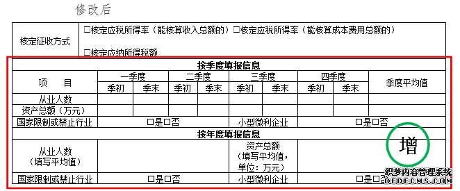 1.修改季度申报和年度申报中小微企业相关判定数据的填报方式。将原表单中的“按季度填报信息”和“按年度填报信息”调整至“核定征收方式”下方,并对该区域表单样式进行修改;